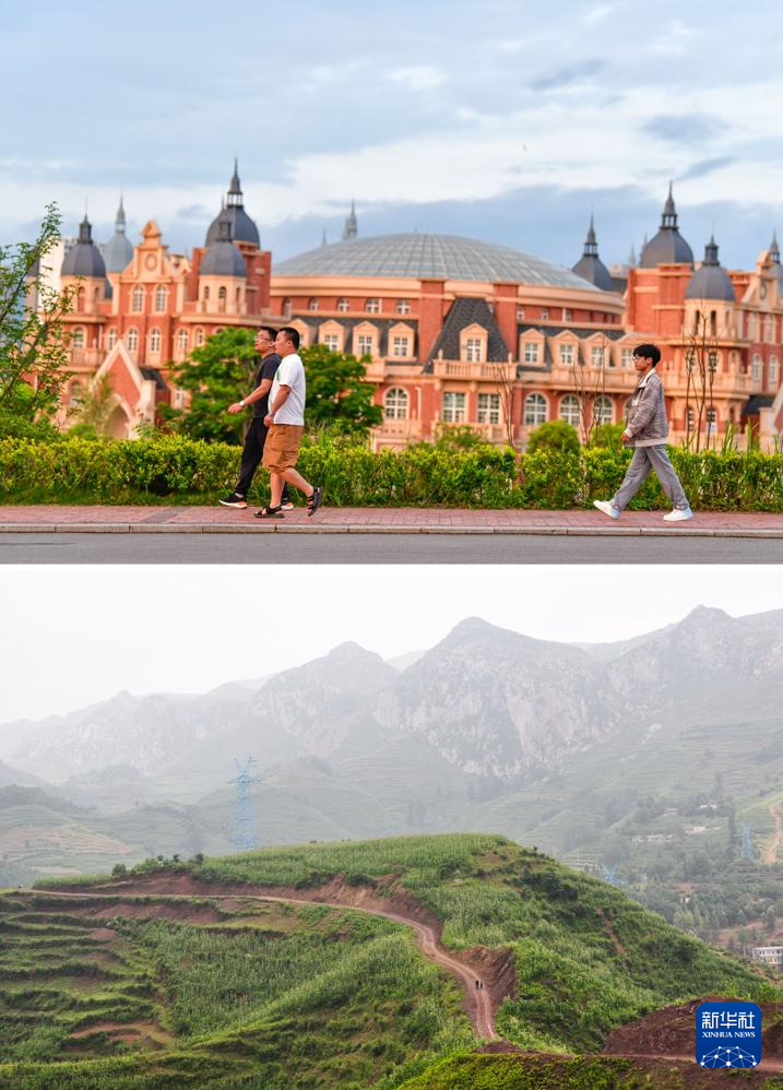 拼版照片:上图为2024年6月4日,邓广伟(右)在贵州黔南科技学院的校园里行走;下图为2014年7月27日,邓广伟与父亲从贵州威宁县的老家步行到镇上转车,准备前往上海检查眼睛。新华社记者 杨文斌 摄