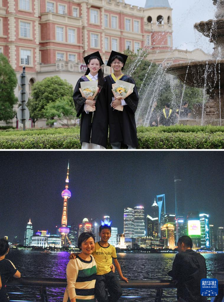 拼版照片:上图为2024年5月21日,邓广伟与同学穿着学士服在贵州黔南科技学院合影留念(采访对象供图);下图为2014年7月29日,邓广伟与爱心人范女士在上海外滩合影。新华社记者 杨文斌 摄