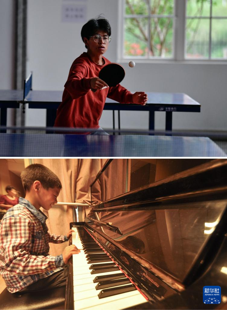拼版照片:上图为2024年6月4日,邓广伟在贵州黔南科技学院的体育馆打乒乓球;下图为2014年7月27日,在上海治疗眼睛期间,爱心人士把邓广伟带到上海音乐学院,他第一次触摸到钢琴。新华社记者 杨文斌 摄