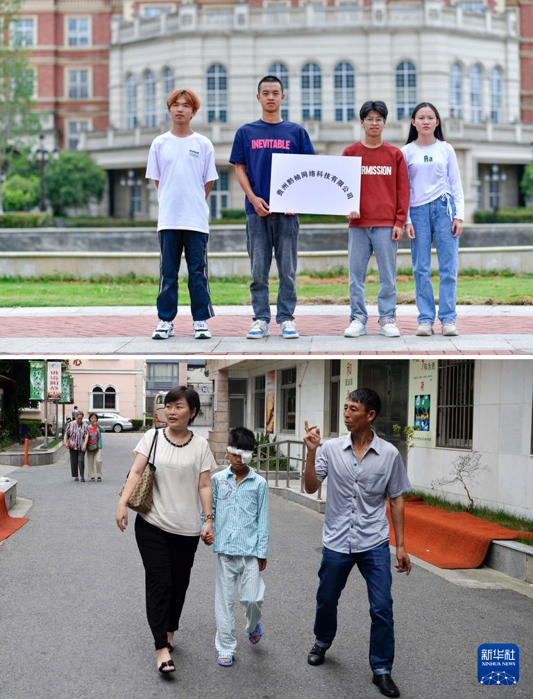 拼版照片:上图为2024年6月5日,邓广伟(右二)与同学们在贵州黔南科技学院里展示公司的牌子;下图为2015年7月17日,爱心人士范女士(左)陪同手术后的邓广伟在上海街头散步。新华社记者 杨文斌 摄