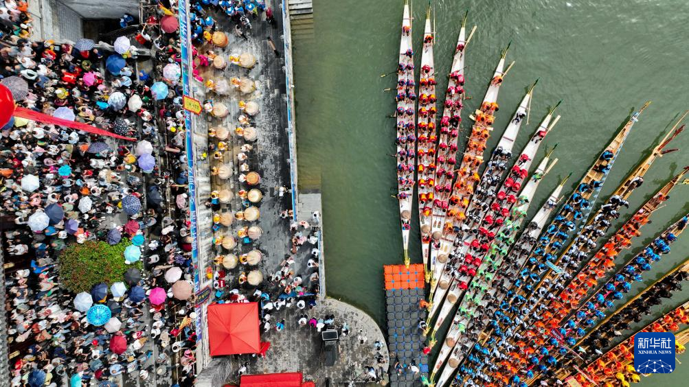 6月10日,龙舟队伍在贵州省黔东南苗族侗族自治州镇远县㵲阳河集结(无人机照片)。