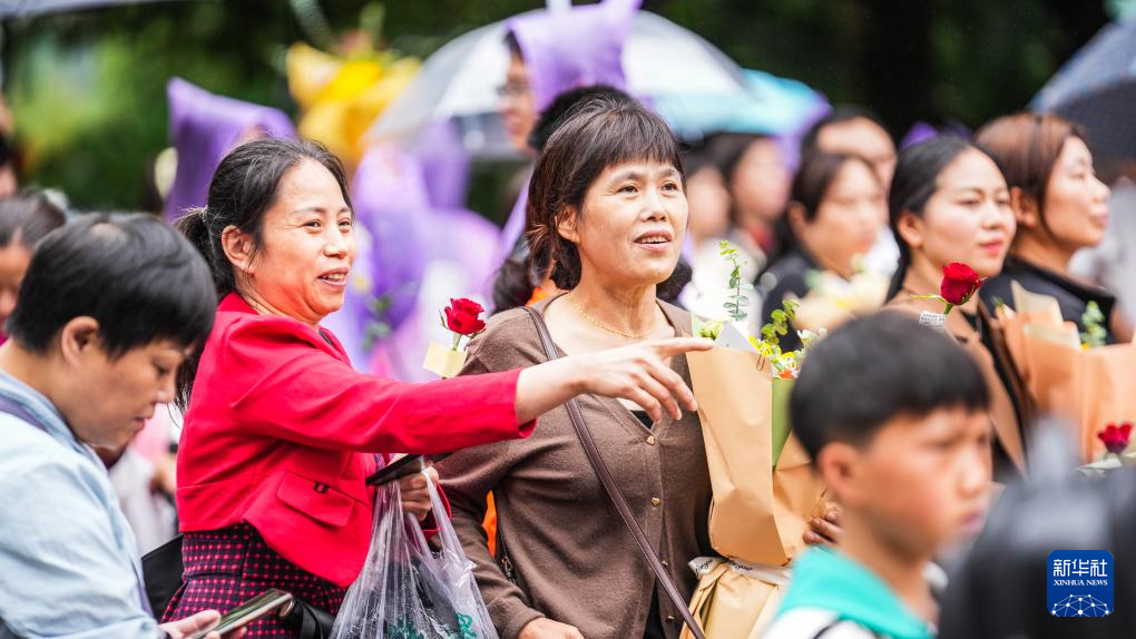 6月9日,在贵州省黔东南苗族侗族自治州丹寨民族高级中学考点,手捧鲜花的考生与家人拥抱。新华社发(陆德华 摄)