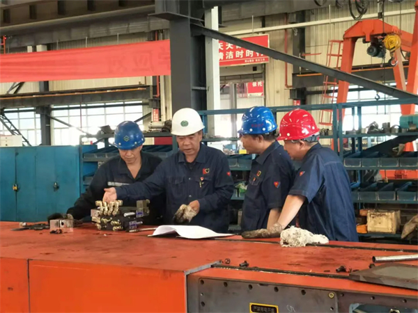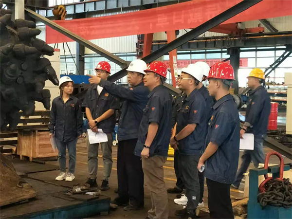 彭天文(左三)在矿修车间生产现场讲解掘进机维修技术。