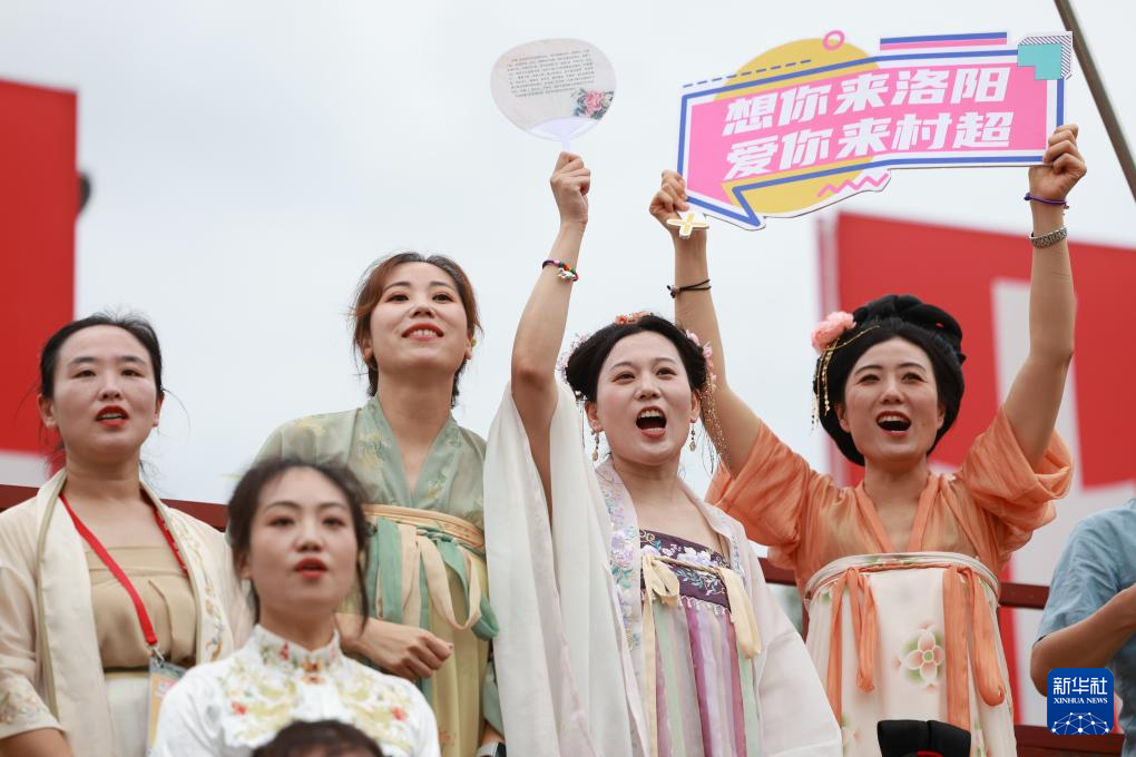 6月10日,洛邑古城足球队拉拉队在场边加油助威。新华社记者 刘续 摄