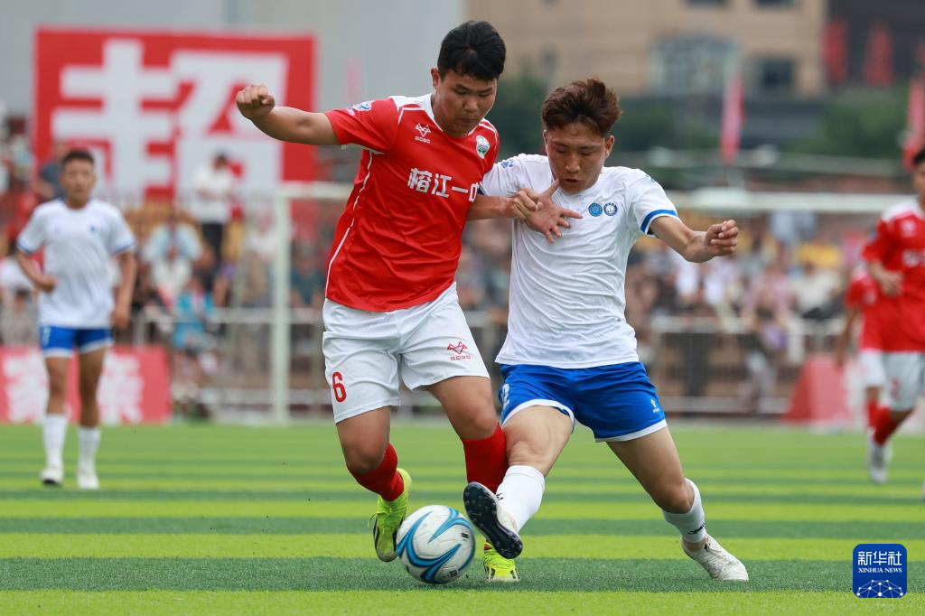 6月10日,洛邑古城足球队球员(中)和呼伦贝尔农垦芥花油足球队球员在比赛中拼抢。新华社记者 刘续 摄