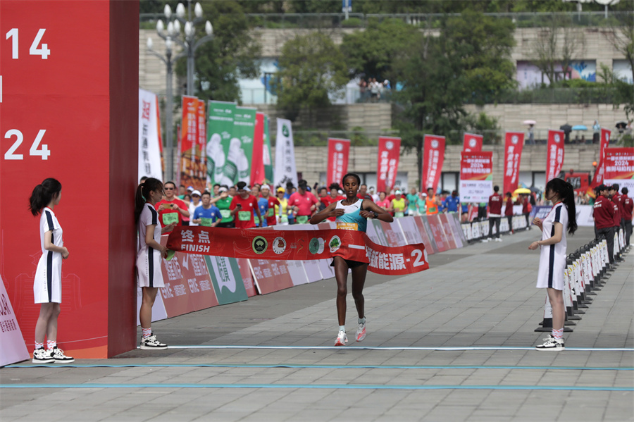 2024贵阳马拉松赛女子组全马第一名冲过终点线。新华网 周远钢 摄