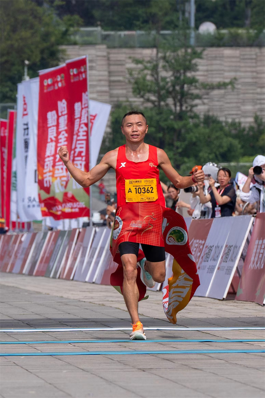 2024贵阳马拉松赛男子组全马第一名、贵州籍选手岑万江冲过终点线。新华网发(龙建睿 摄)