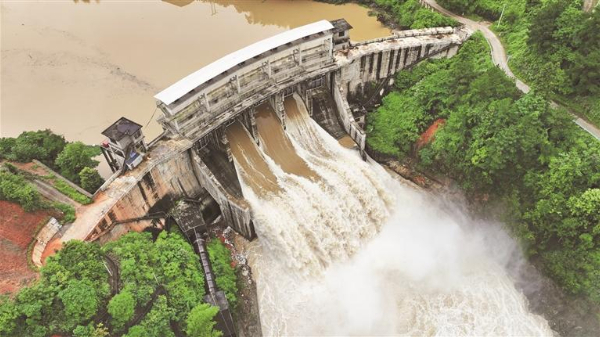 连日来,我省各地全力做好汛期灾害防范、抢险救灾工作,保障人民群众生命财产安全。图为6月18日,位于锦屏县境内的八河水电站开闸泄洪(无人机照片)。新华社发(杨晓海 摄)