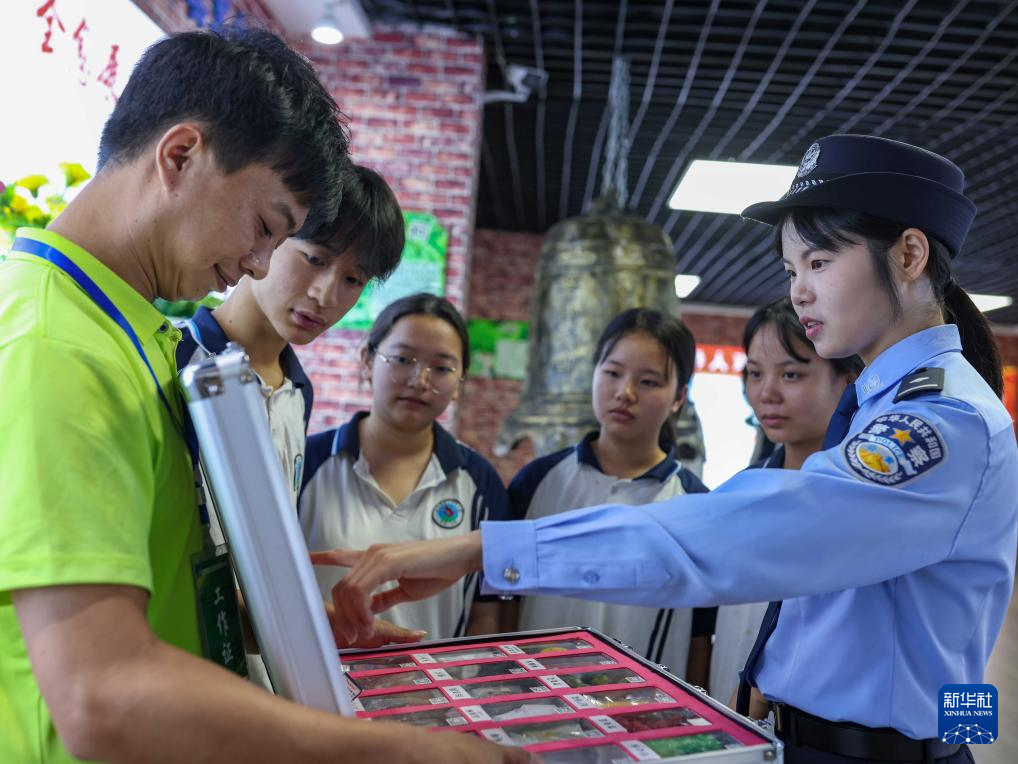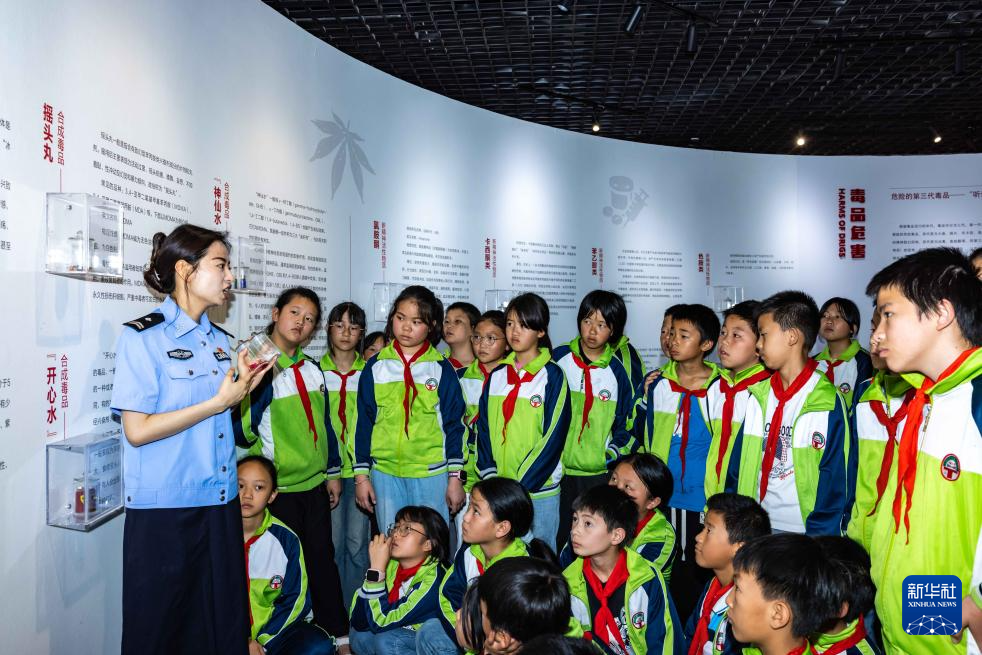 6月25日,民警在贵州省安顺市禁毒宣传教育基地为学生讲解毒品相关知识。新华社发(陈熙 摄)
