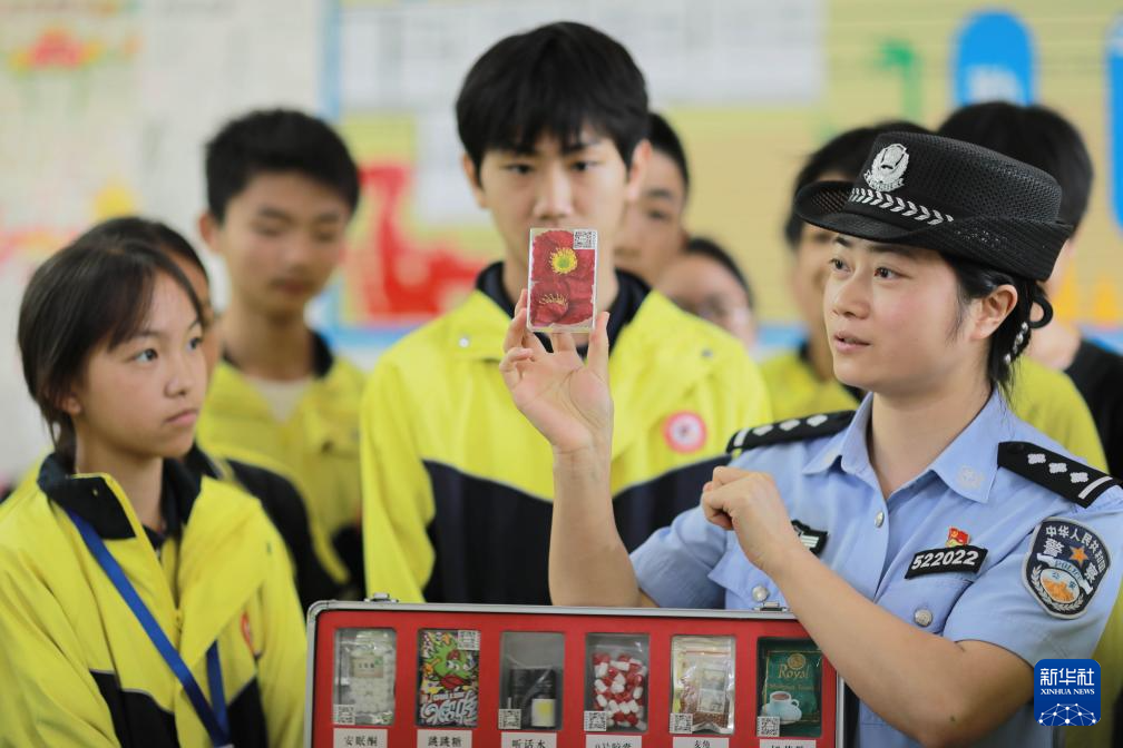 6月25日,在贵州省赤水市天台学校,民警为学生讲解禁毒知识。新华社发(王长育 摄)