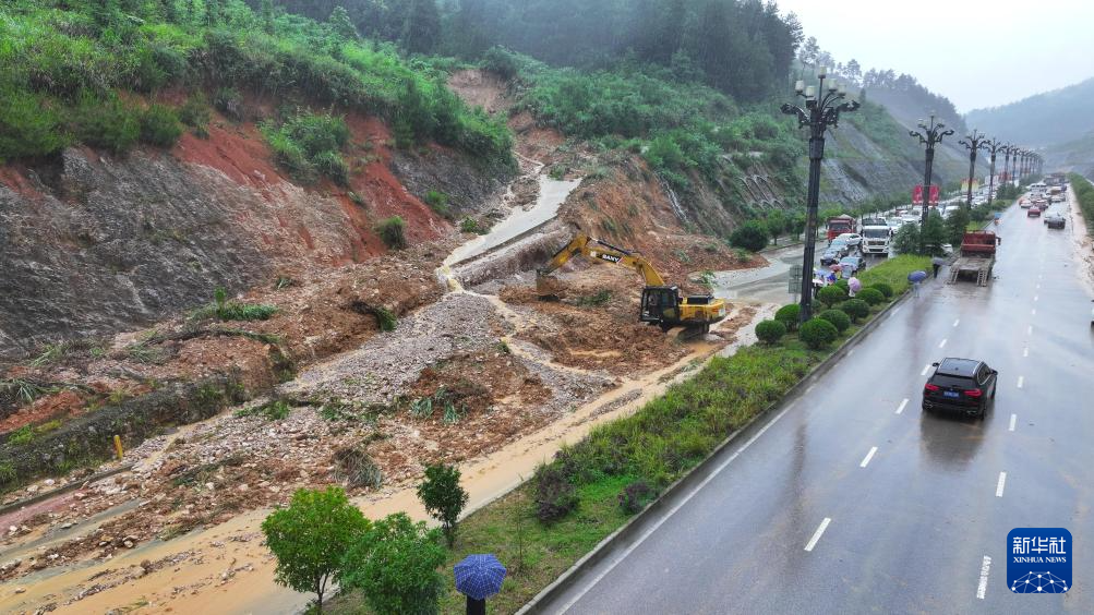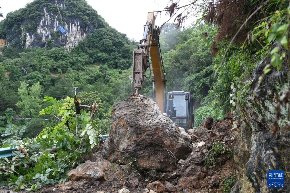 6月29日,在贵州省遵义市余庆县白泥镇哨溪村一处山体滑坡现场,工作人员驾驶机械设备清理滑坡山石。