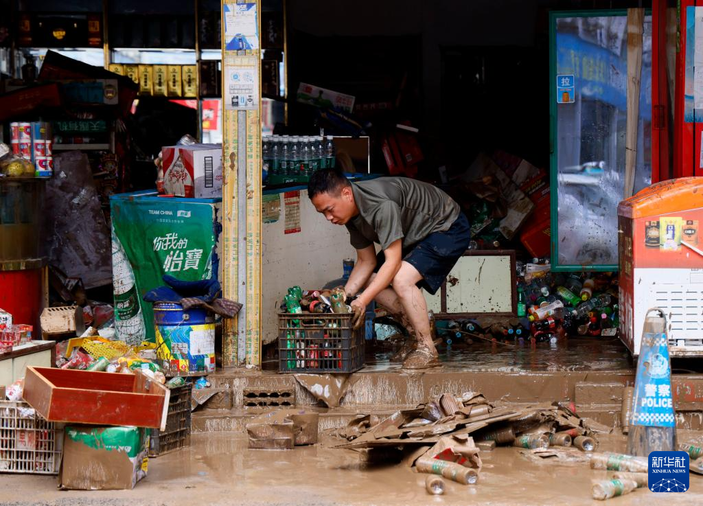 6月29日,在贵州省遵义市汇川区长沙路社区,一名商户清理商品。