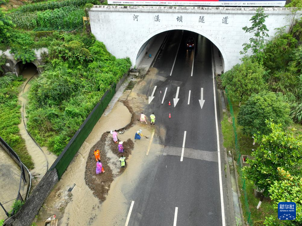 6月29日,在贵州省黔东南苗族侗族自治州黄平县,当地组织工作人员清理道路(无人机照片)。
