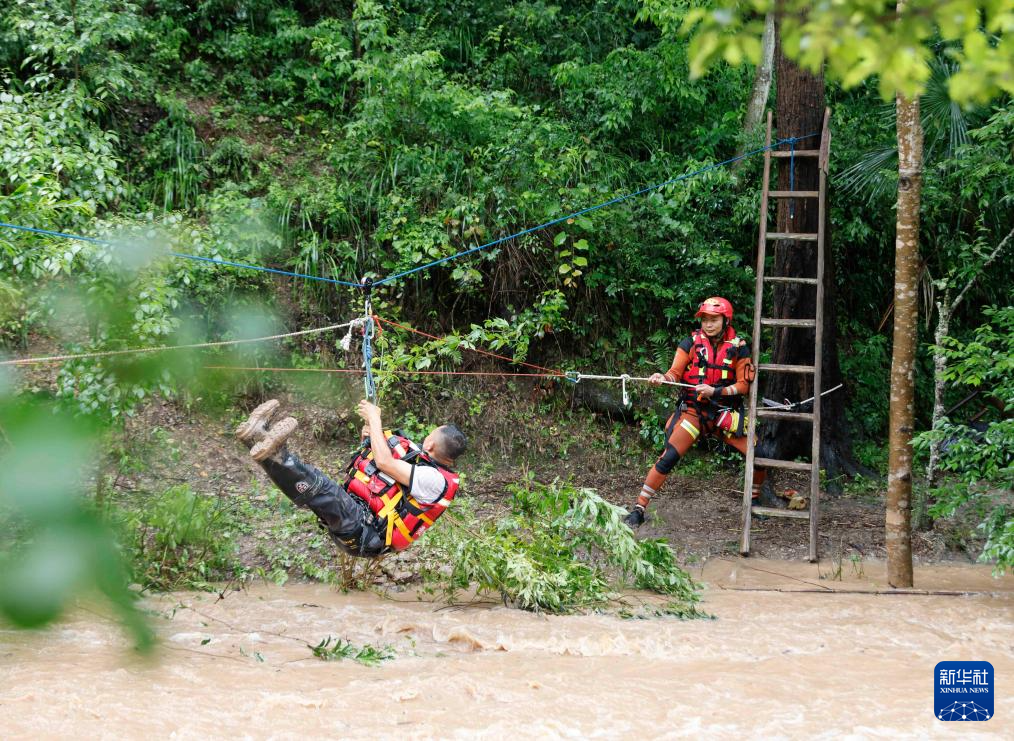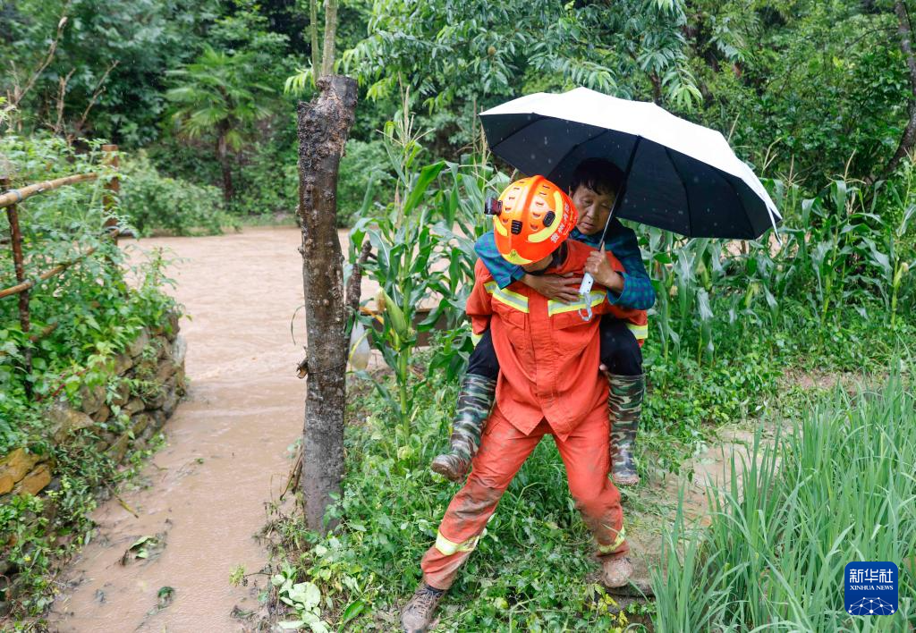 6月29日,在贵州省黔东南苗族侗族自治州施秉县城关镇伍旗村,消防员转移被困村民。