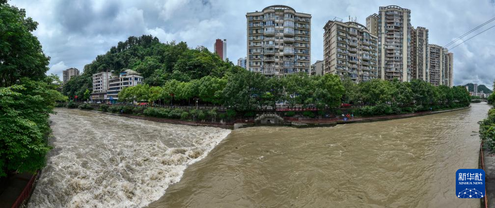 6月29日,洪水经过贵州省遵义市主城区(无人机照片)。