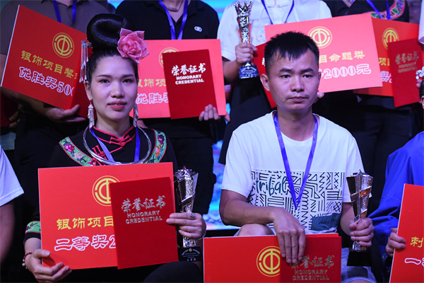 7月5日,一对80后银匠夫妻在热烈的掌声中登上领奖台,双手各捧着2024年黔东南州银饰、刺绣手工制作职工职业技能大赛银饰花丝类“二等奖”荣誉证书、奖杯以及奖金,脸蛋儿笑得像花一样灿烂。