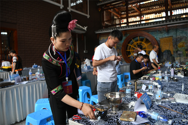 7月5日,贵州省凯里市,选手吴秋燕在参加银饰制作比赛。(杨仁海 摄)
