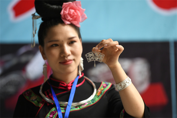7月5日,贵州省凯里市,苗族选手吴秋燕在展示银饰比赛作品。(杨仁海 摄)