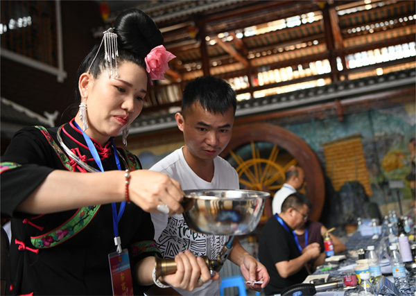 7月5日,贵州省凯里市,苗族选手吴秋燕(左)夫妇在参加银饰制作比赛。(杨仁海 摄)