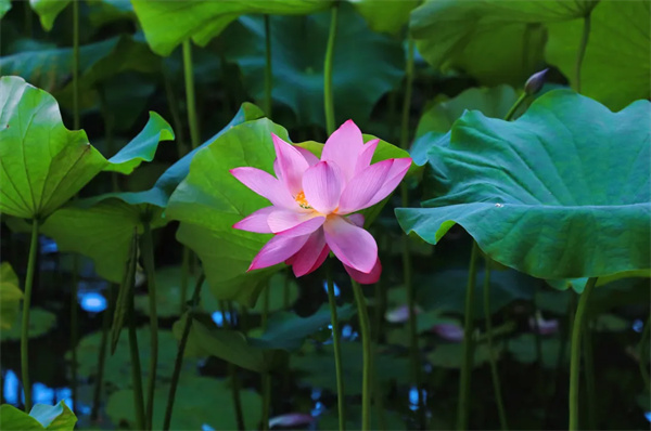 站在观荷台上,一朵朵、一簇簇粉红色的荷花从荷叶间冒出头来,或肆意怒放,或含苞待放,与周围郁郁葱葱的树林美景融为一体,令人仿佛置身于世外桃源。