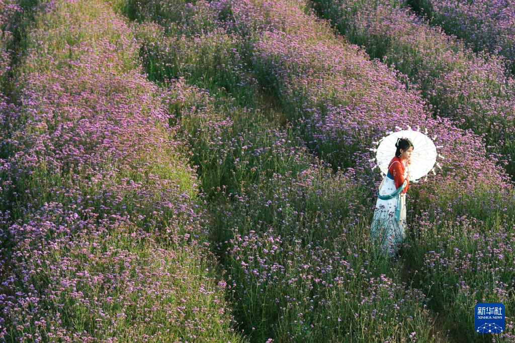 游客在贵州省龙里县龙山镇金星村姊妹湖景区的花海中留影(7月25日摄)。新华社记者 杨文斌 摄