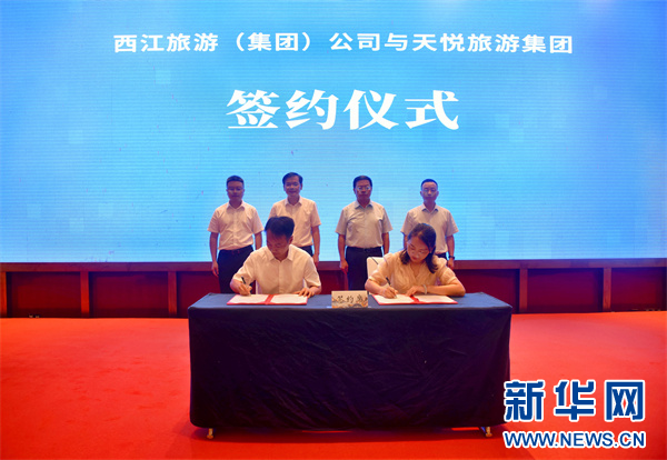 推介会现场,贵州西江千户苗寨文化旅游投资(集团)有限公司总经理杨春艳致辞并推介《仰欧桑》剧目营销政策及相关旅游产品。《仰欧桑》艺术总监、总导演赵海风详细介绍了《仰欧桑》剧目内容、创意设计及发布上演等情况。最后,由西江旅游(集团)公司代表与省内外多家旅行社举行了现场签约仪式。