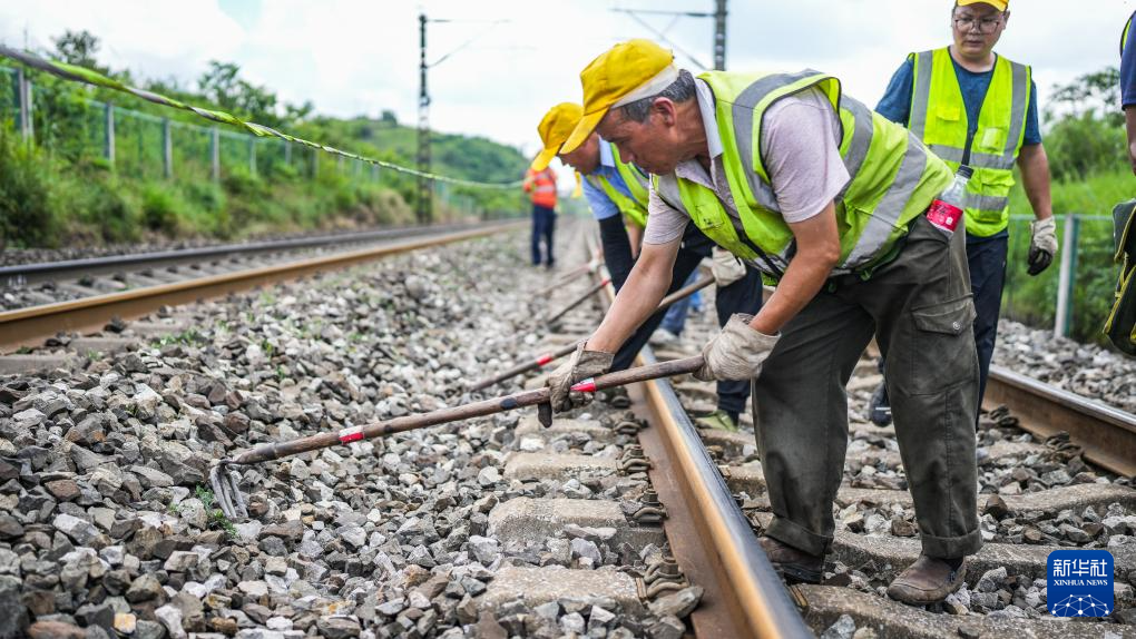 8月6日,工人在沪昆铁路贵州段整理线路。新华社记者 陶亮 摄