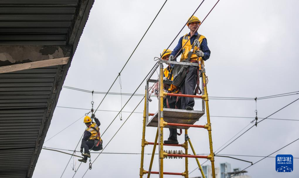 8月6日,工人在安顺站进行接触线更换施工。新华社记者 陶亮 摄