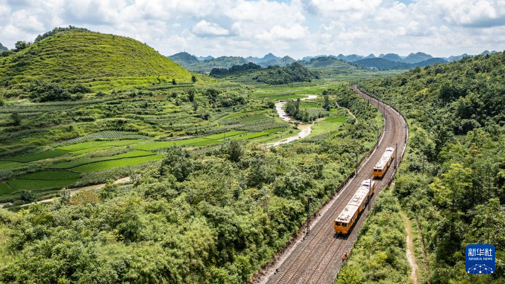 8月6日,工程车辆在沪昆铁路贵州段进行线路大机捣固施工(无人机照片)。新华社记者 陶亮 摄