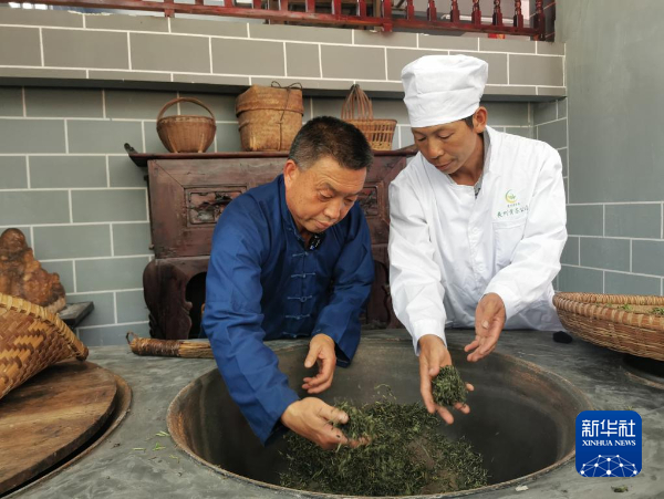 王飞(左)与村民交流手工制茶技艺。(孙伟 摄)