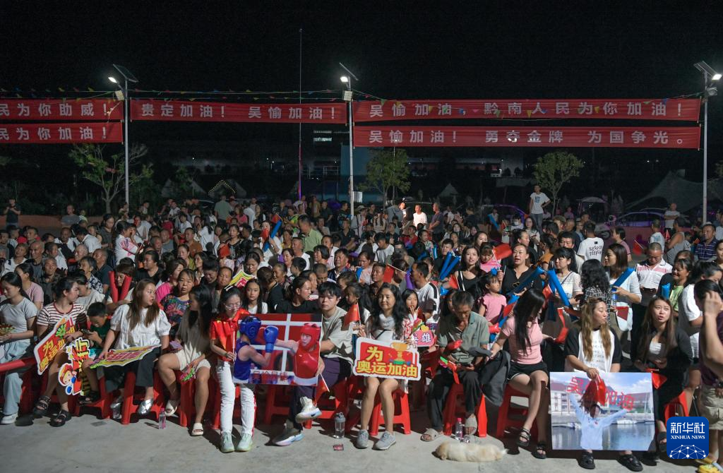 吴愉出生于贵州省黔南布依族苗族自治州贵定县昌明镇。从8月9日晚至10日凌晨,吴愉家乡的父老乡亲们齐聚昌明镇文江村篮球场,收看电视直播,一起见证吴愉在巴黎奥运会上夺冠的高光时刻。