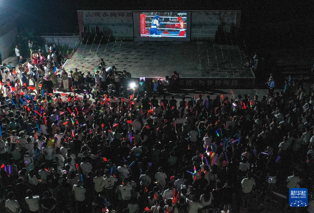 8月10日,吴愉家乡的人们在观看吴愉对阵土耳其选手恰克尔奥卢的电视直播(无人机照片)。
