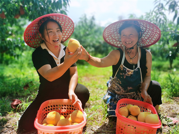 九龙村锦绣黄桃种植基地由村里致富能人王小丽夫妻俩创办,2018年,夫妻二人通过土地流转,在九龙村种植了80多亩桃树,是当地发展特色种植、推动乡村振兴的重要产业之一。今年是基地种植黄桃的第六年,为保证黄桃品质,夫妻俩坚持使用农家肥、不施农药,人工除草;果子成熟后期套袋处理,物理防虫害等生态种植方式。依托有机种植和科学管理。今年的黄桃不仅个头更大,品质相较于前两年也有大幅提升。