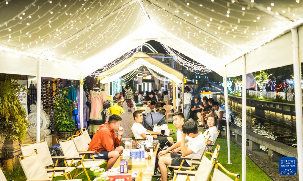 游客在六盘水市钟山区水城古镇休憩聊天(8月8日摄)。新华社记者 陶亮 摄