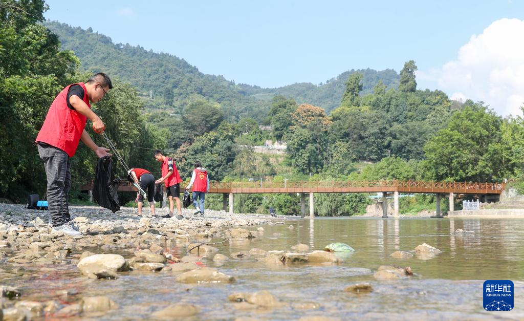 8月15日,志愿者在贵州省开阳县禾丰乡马头村青龙河畔捡拾垃圾。新华社发(袁福洪摄)