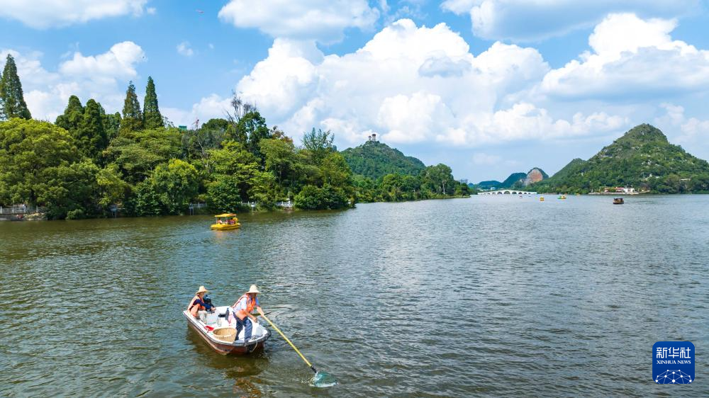 8月15日,志愿者在贵州省安顺市西秀区虹山湖打捞湖面漂浮物(无人机照片)。