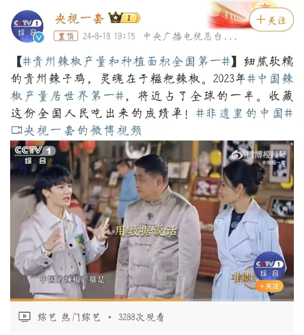 日前,《非遗里的中国》贵州篇在央视一套综合频道播出,节目中,歌手周深和主持人龙洋、故宫博物院学术委员会主任单霁翔一道,品尝了香辣可口的辣子鸡。周深还现场为家乡的辣椒代言,希望更多的游客来体验贵州辣椒的味道。