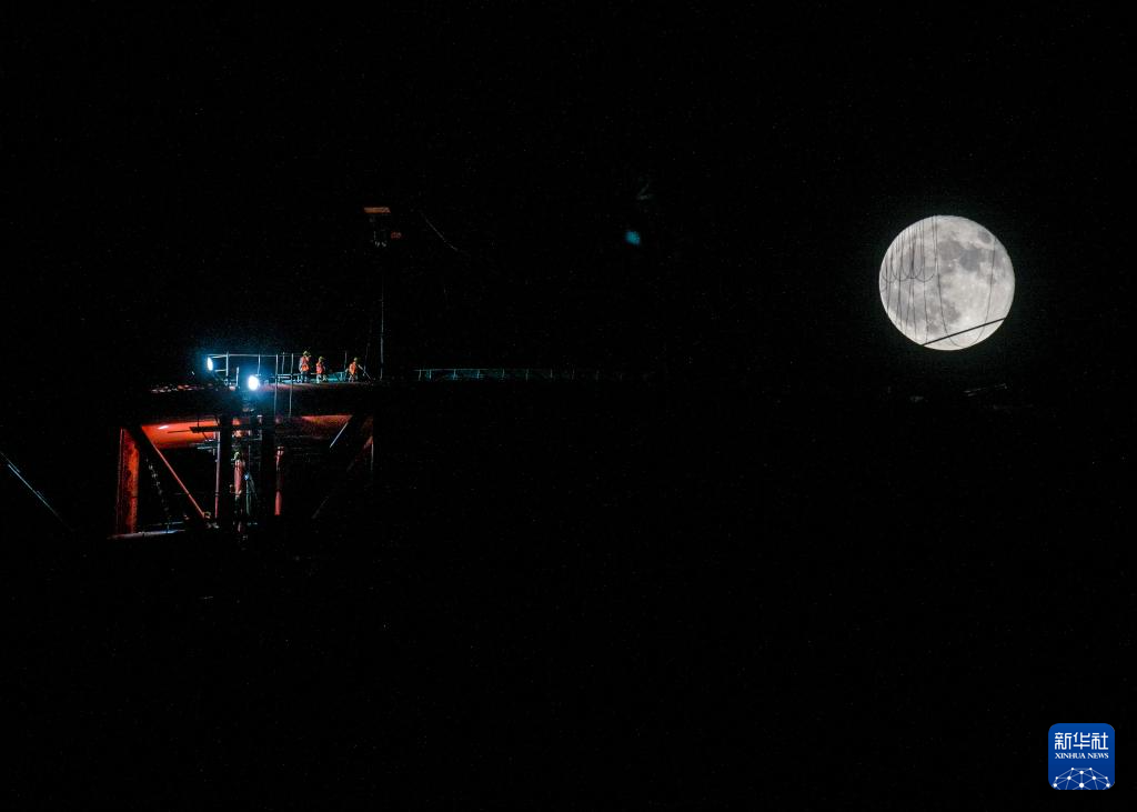 8月20日,月光下的贵阳至平塘高速公路马场河特大桥(二次曝光照片)。新华社记者 杨文斌 摄