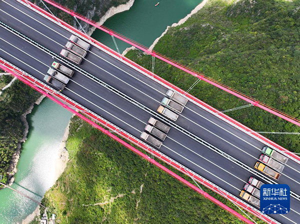 8月24日,大货车停放在桐梓河特大桥上进行荷载试验(无人机照片)。