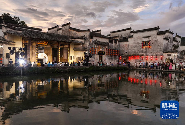 7月25日晚,游客在黄山市黟县宏村月沼旁欣赏音乐会表演。新华社发(施亚磊 摄)