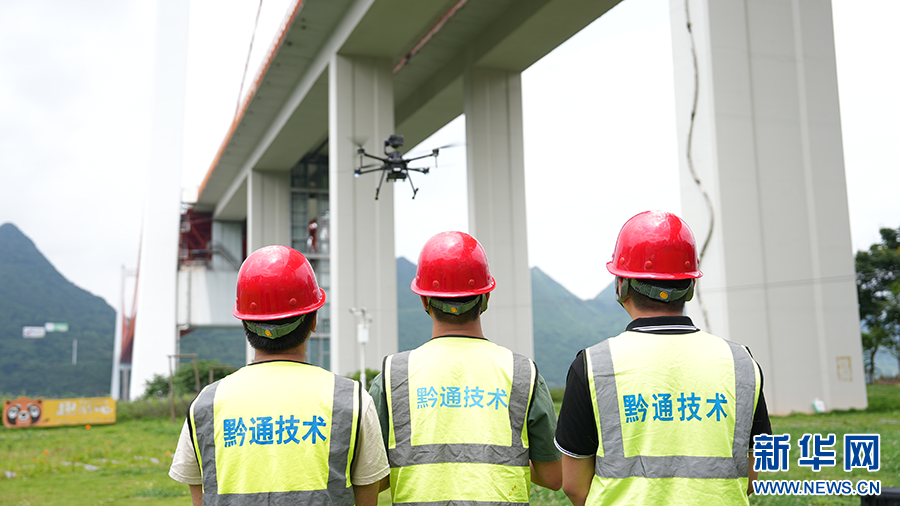 技术人员对坝陵河大桥进行无人机定期检测。新华网 周远钢 摄