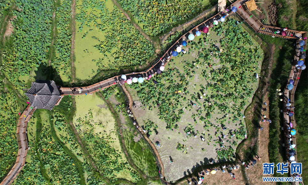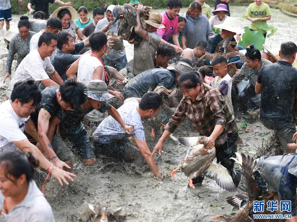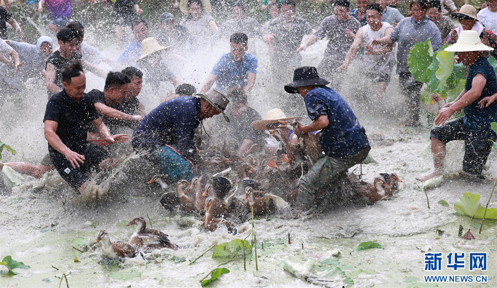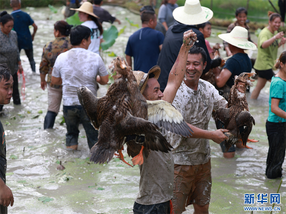 8月27日,在贵州省从江县洛香镇荣新村四联侗寨,游客、村民参与荷花田抢鸭子活动。新华网发(梁辉波 摄)