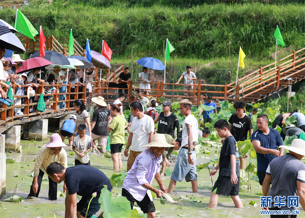 8月27日,在贵州省从江县洛香镇荣新村四联侗寨,游客、村民参与抓鱼活动。新华网发(梁辉波 摄)
