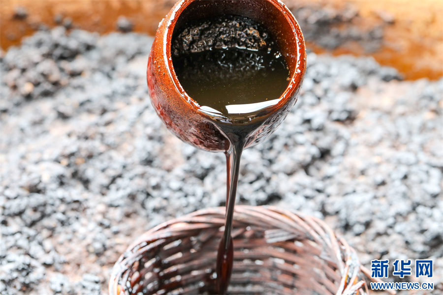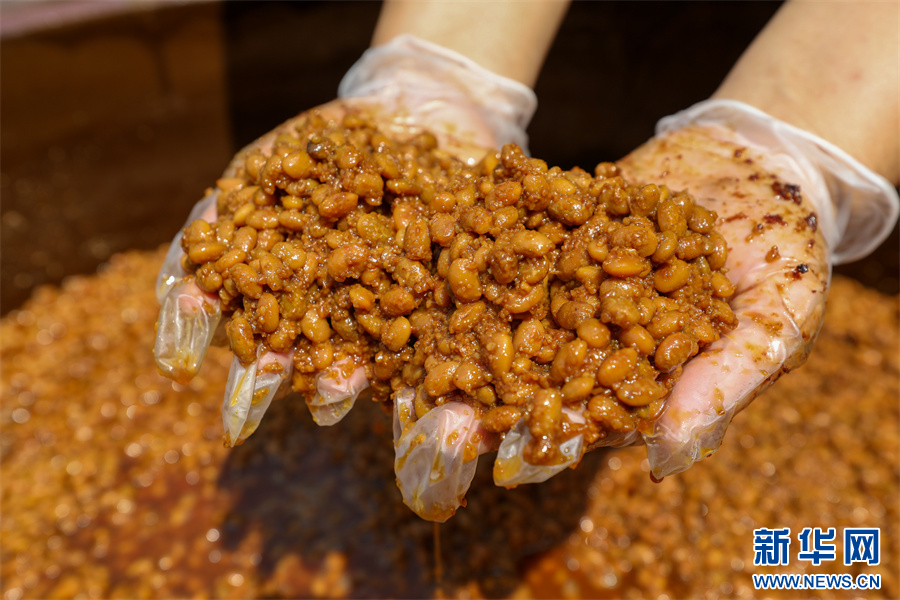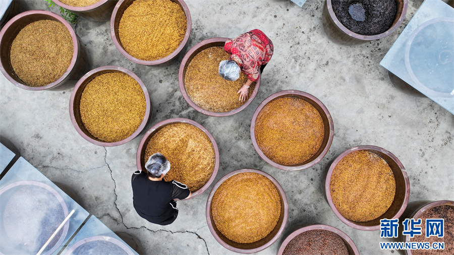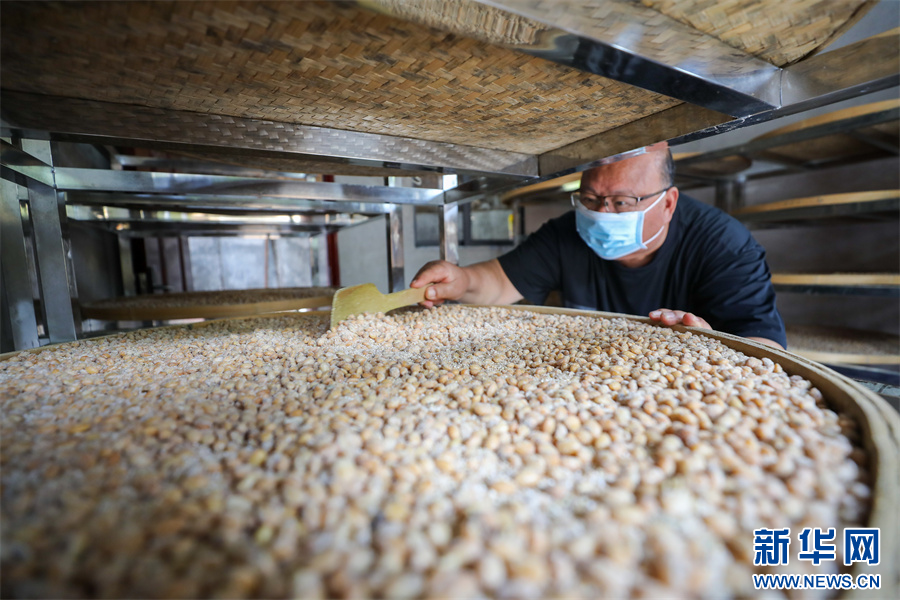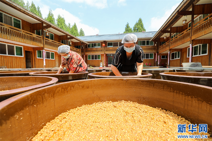 村民在贵州省铜仁市江口县民和镇艾坪村一家古法酱油加工厂翻晒黄豆酱料(8月29日摄)。新华网发(李鹤 摄)