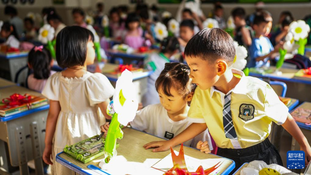 9月1日,贵阳市实验小学未来方舟分校一年级一班学生在领取礼物。新华社记者 陶亮 摄