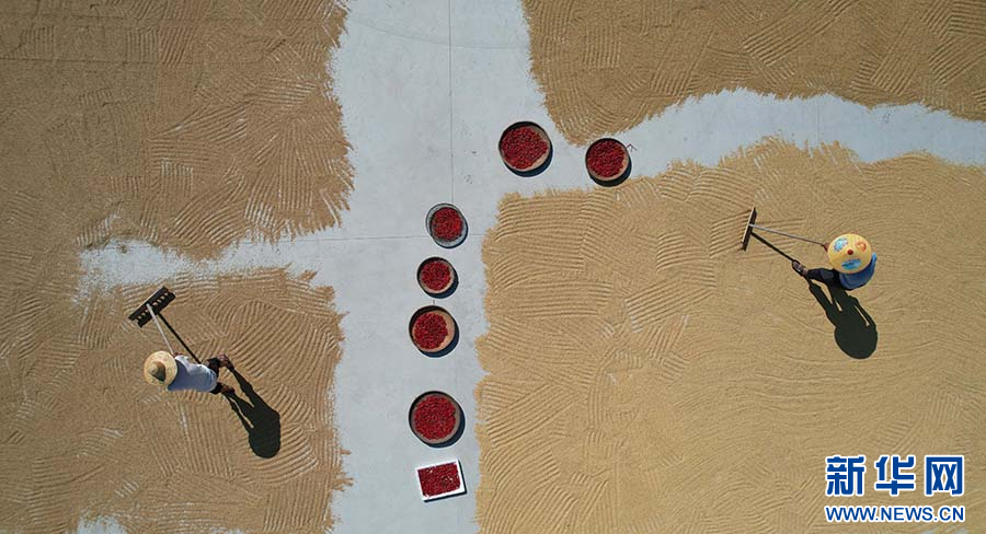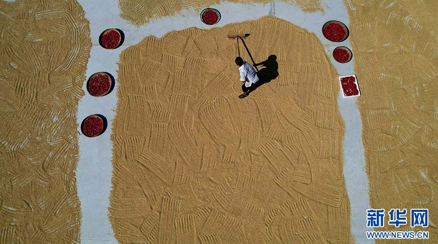 9月2日,在贵州省从江县贯洞镇腊阳村的鼓楼坪上,村民们晾晒稻谷。新华网发(梁辉波 摄)