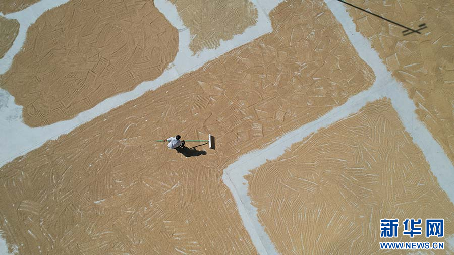 9月2日,在贵州省从江县贯洞镇腊阳村的鼓楼坪上,村民们晾晒稻谷(无人机照片)。新华网发(梁辉波 摄)