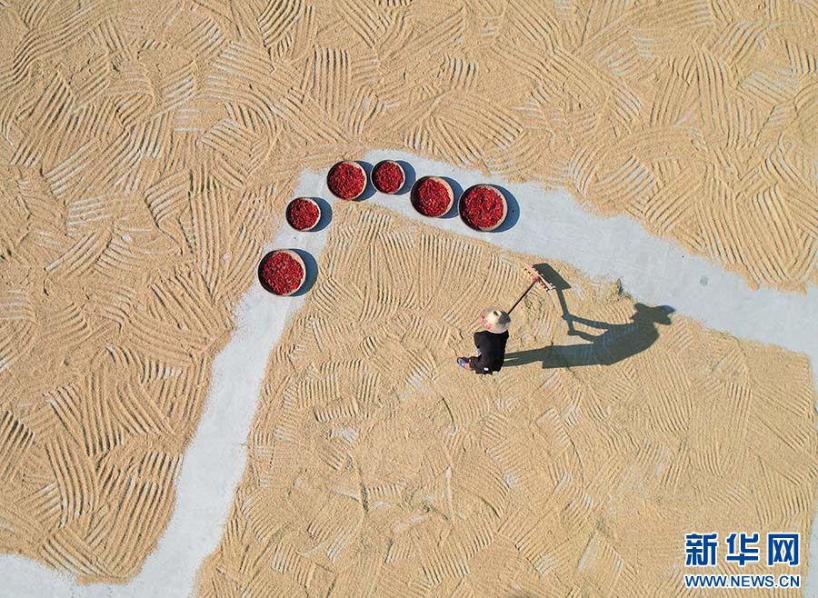 金秋时节,贵州省黔东南苗族侗族自治州从江县贯洞镇腊阳村迎来水稻丰收,村民们利用难得的晴好天气,将稻谷进行晾晒,构成了一幅幅“丰”景画卷。