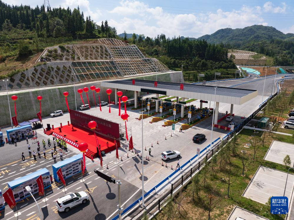 9月13日,车辆在桐梓南站外等待进入金仁桐高速(无人机照片)。新华社记者 刘续 摄