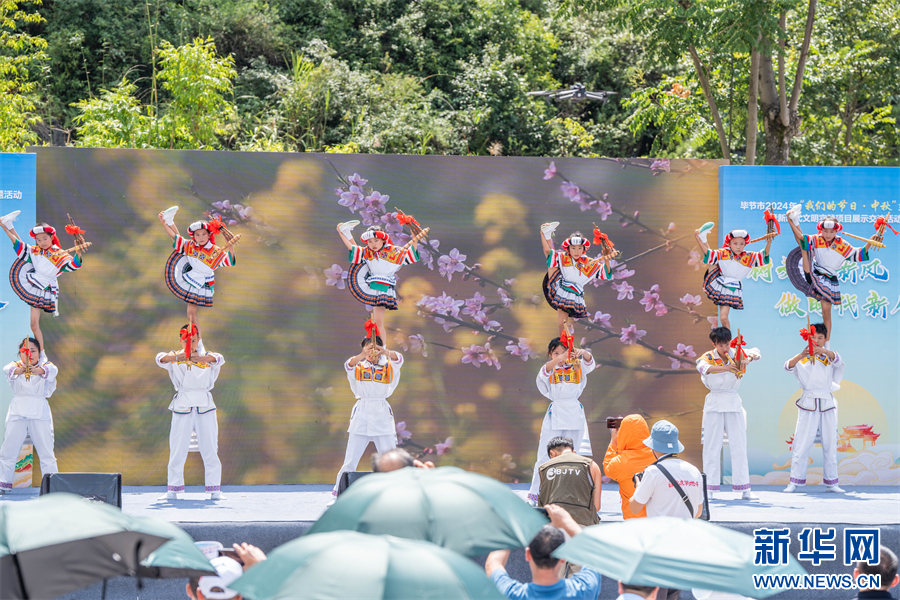 9月13日,在贵州省毕节市织金县平远古镇活动现场,演员在舞台上表演节目。新华网发(罗大富 摄)